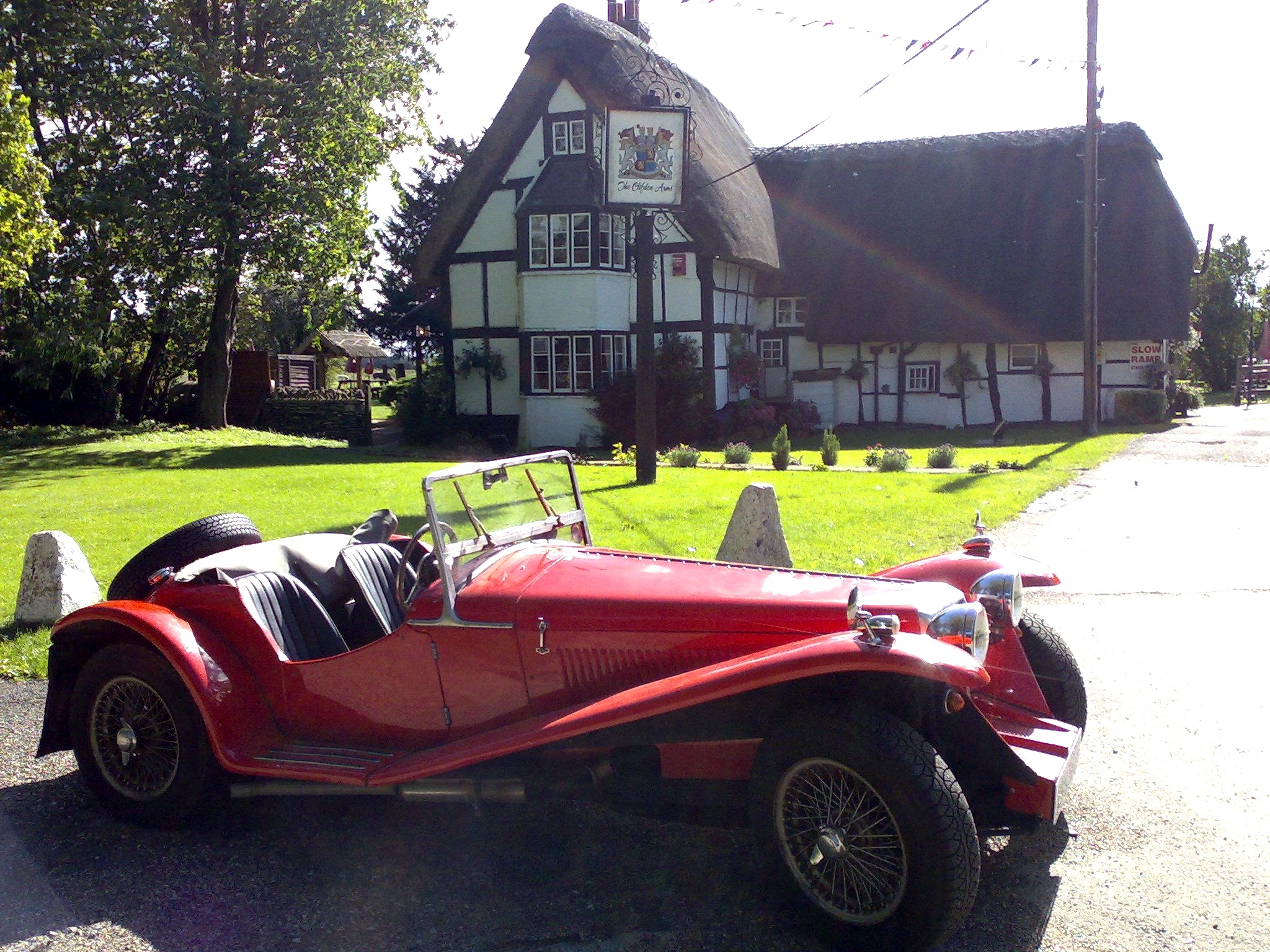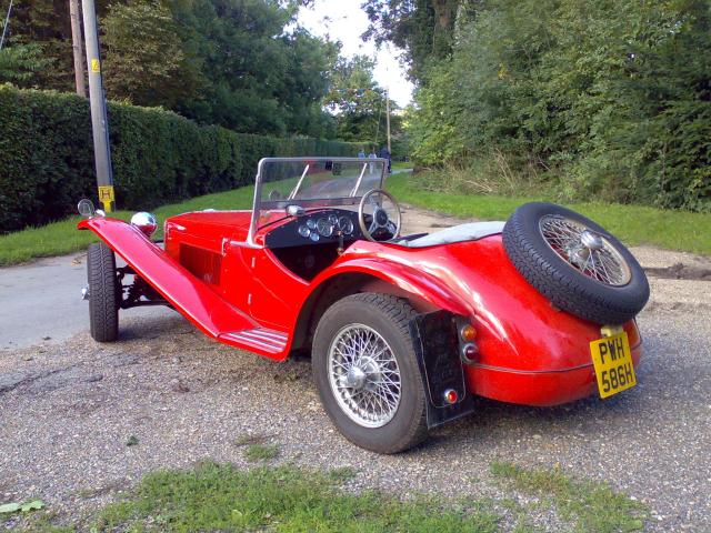 Knock on wire wheels, Triumph GT6 front suspension, 5 Link rear axle with adjustable coil-over shock absorbers.